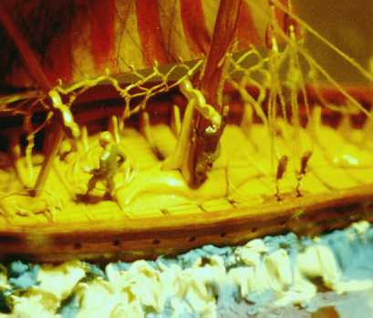 Hier sehen wir einen Blick von oben des Modells. Das Schiff kämpf gegen die Wellen. Sie kreuzt gegen den Wind, während die schäumenden Wasser der Reling entgegenstossen. Der Beitass hält das Segel fest.